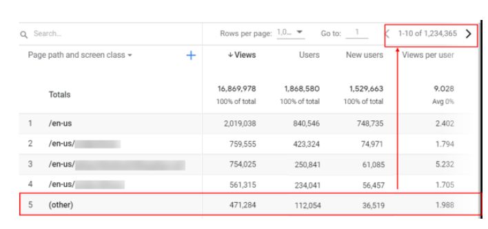 Quando você usa dimensões de alta cardinalidade, as tabelas de relatórios podem atingir seu limite de linhas, fazendo com que os dados sejam agrupados sob a linha “(other)”. Isso pode acontecer mesmo que a dimensão utilizada no relatório tenha baixa cardinalidade, pois outras dimensões no processamento dos dados podem ter valores únicos elevados.