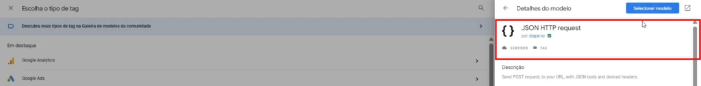 Vá em Tags → Clique em Nova → Clique em Configuração da Tag → Acesse Descobrir mais tipos de tag → Procure por JSON HTTP Request → Instale o template.