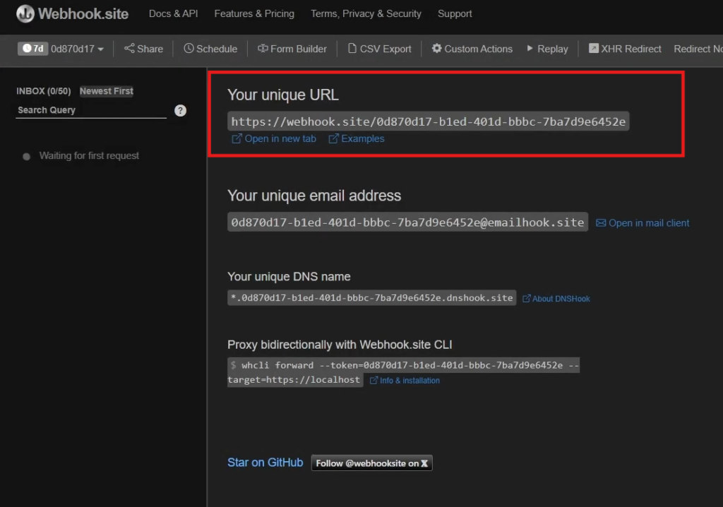 Neste exemplo, utilizaremos o webhook.site para validar se o webhook está sendo enviado corretamente.