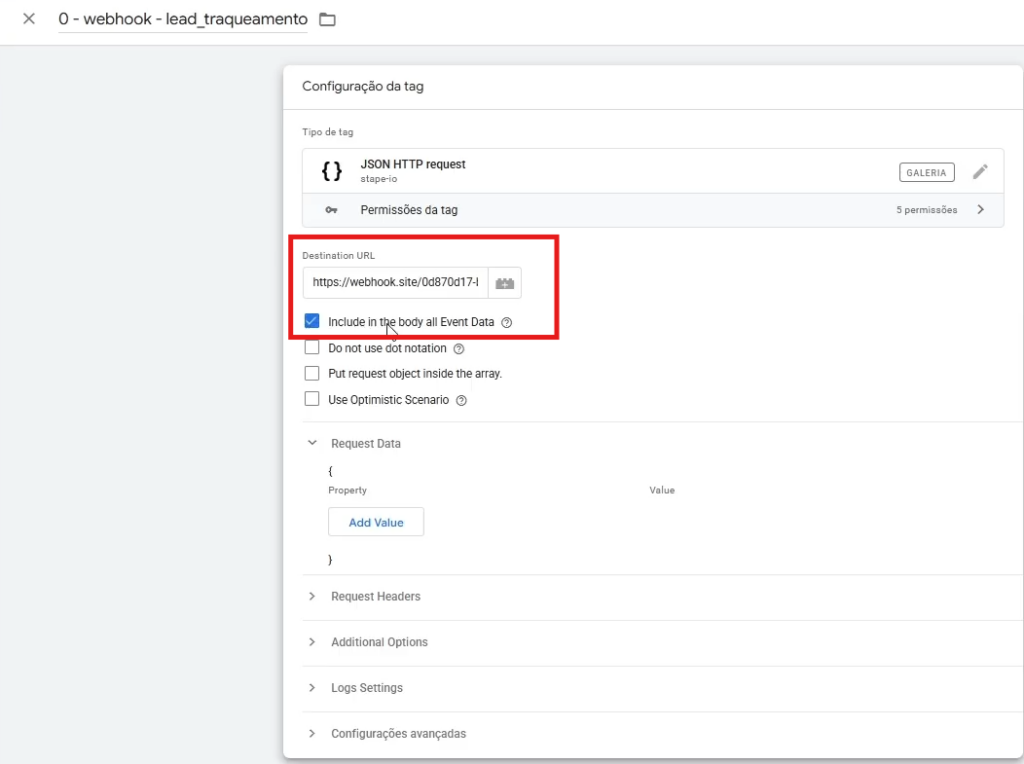 Acesse Tags → Nova → Selecione a tag JSON HTTP Request → No campo Destination URL, cole a URL obtida no webhook.site
