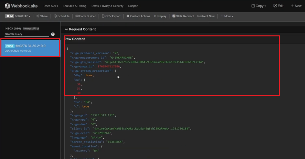 Em seguida, acesse o webhook.site e confirme se a requisição chegou com todos os parâmetros esperados. Se os dados aparecerem corretamente, o Webhook está funcionando.