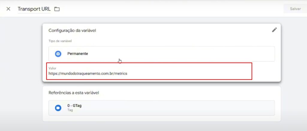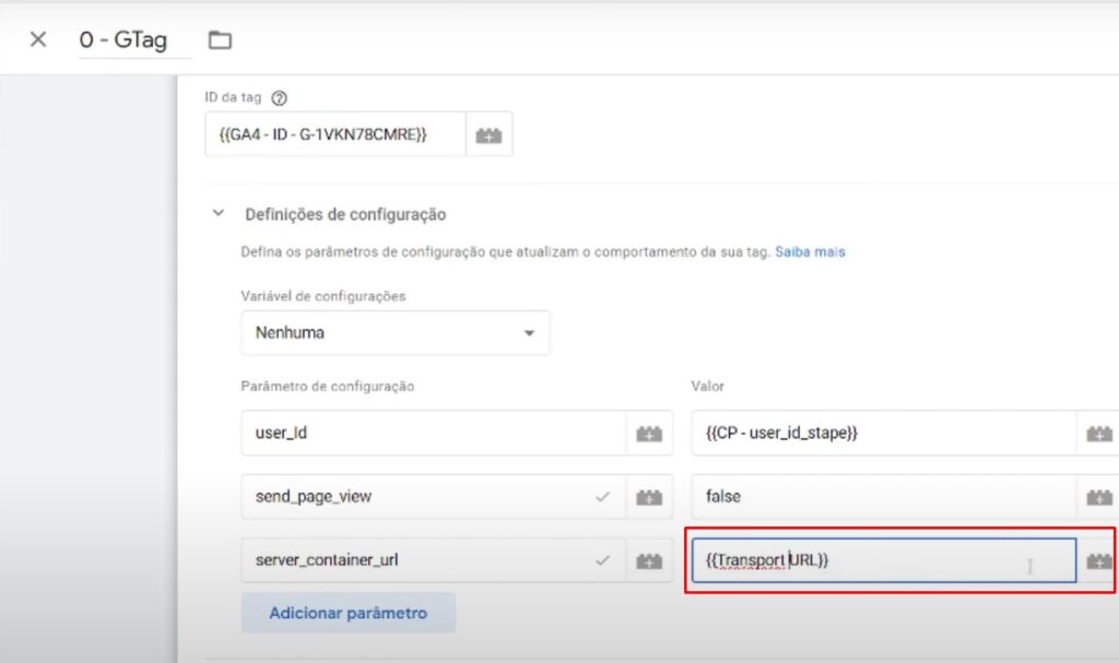 O ‘Transport URL’ é a variável que corresponde ao ‘server_container_url’, utilizada na tag de configuração do seu ‘Client’, especificamente na tag de configuração do GA4.