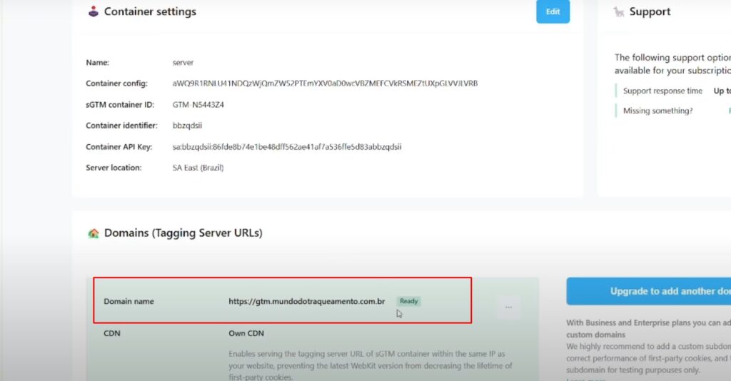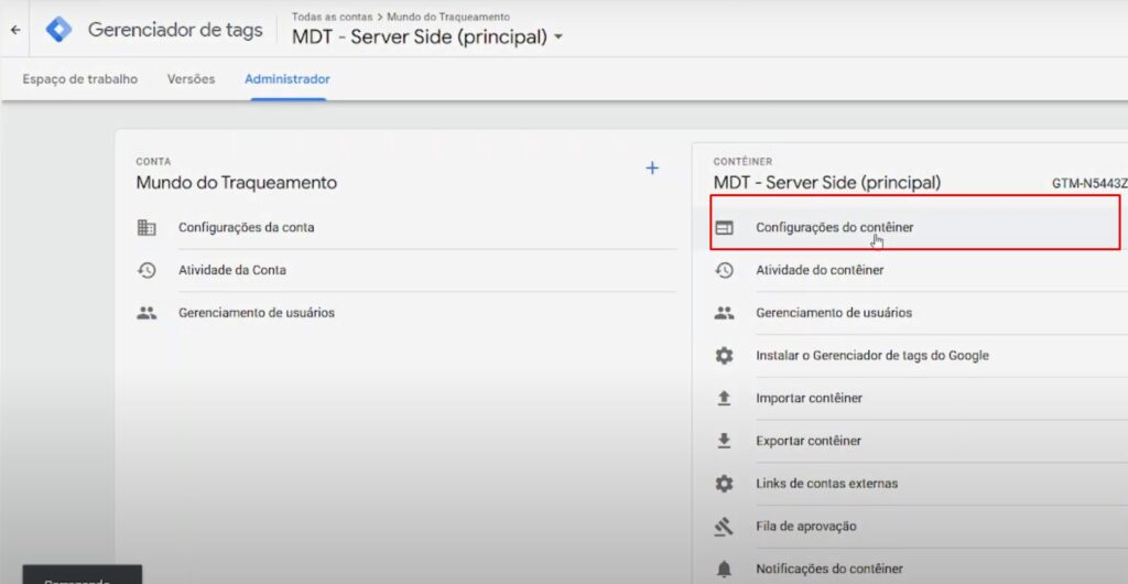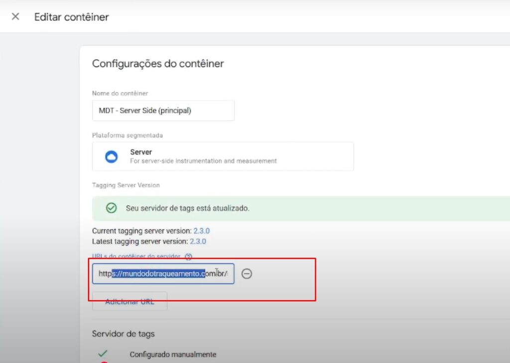 • Também abra as configurações do seu contâiner do sGTM e verifique se a url cadastrada é a mesma da Stape.IO