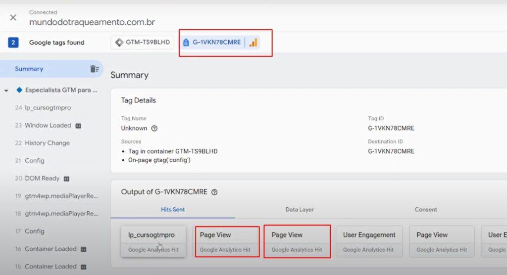 • Dentro do seu ‘debug’ do sGTM confira na aba do Google Analytics 4 se o mesmo evento está sendo enviado de duas instâncias diferentes como no exemplo abaixo.