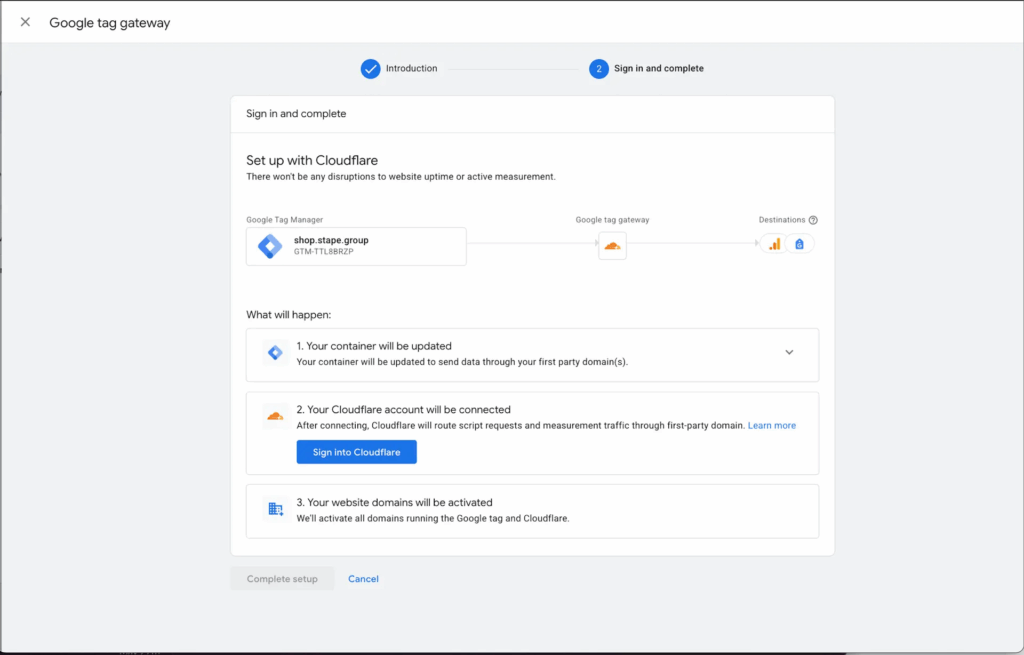 1. Em GTM → Admin → Google Tag Gateway → Cloudflare e selecione o domínio.