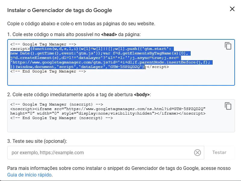 Agora, com a extensão instalada, acesse qualquer conta de GTM que você tenha e copie o código header dela, porém, copie apenas o que estiver entre parênteses conforme exemplo abaixo.