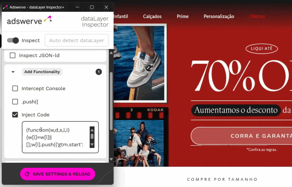 Acesse o site da sua preferência e abra o Adswerve, busque a opção ‘Inject Code’ e cole o código que você copiou.