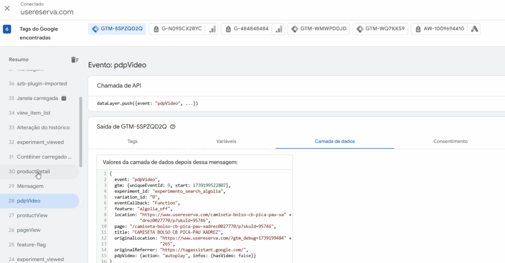 Agora, faça um debug utilizando seu Google Tag Manager, se você seguiu todo o passo-a-passo corretamente, vai notar que todos os eventos que foram configurados dentro do site começarão a aparecer conforme o print abaixo: