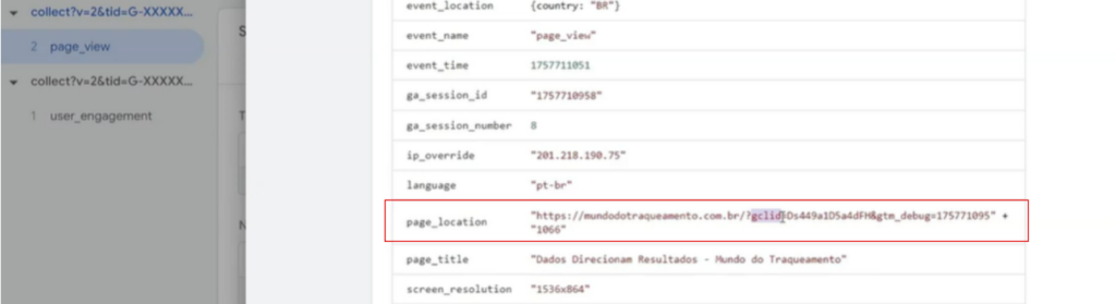 No evento de page_view, localize o ‘Vinculador de Conversões’ do Google e verifique se a configuração funcionou.