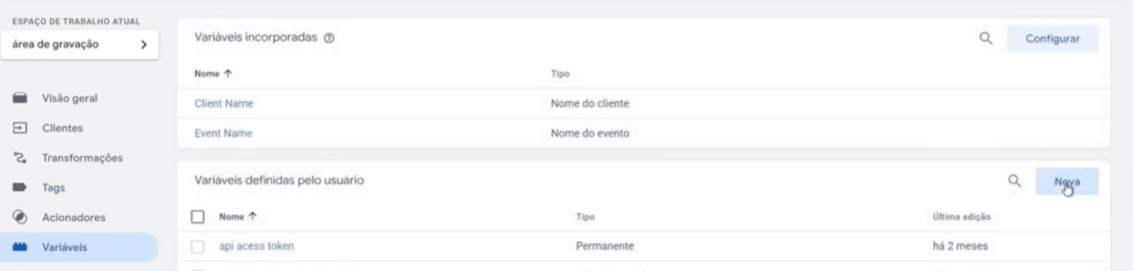 No Google Tag Manager server side, busque a aba ‘Variáveis’ e crie uma nova variável