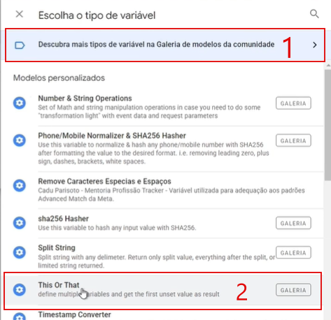 Dentro do seu Google Tag Manager Server Side, acesse a aba de ‘Variáveis’, já dentro dela, busque pela variável ‘This or That’, caso não tenha, busque essa variável na aba de ‘Mais tipos de Variáveis na galeria de modelos da comunidade’ e salve no seu workspace.