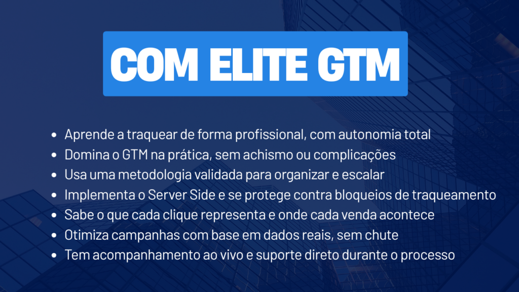 Se você tem um e-commerce e busca melhorar o rastreamento de dados para otimizar suas campanhas de marketing, o Curso Elite GTM pode ser exatamente o que você precisa. Ele é ideal para empresas que querem garantir a coleta precisa de informações, mesmo com as mudanças em privacidade e bloqueadores de cookies. Com o GTM Server Side, você terá mais controle sobre os dados, o que pode ser um diferencial estratégico para aumentar conversões e reduzir desperdícios de investimento em anúncios. Se seu negócio depende de campanhas digitais eficazes e de dados confiáveis, esse curso é uma solução que se adapta a várias realidades.