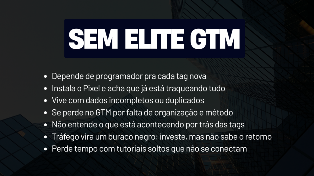 A maioria dos donos de e-commerce e gestores que trabalham com tráfego têm um sistema completamente cego de mensuração. Eles até acham que o Pixel e o Analytics estão funcionando… mas sem um traqueamento profissional via GTM, os dados estão sempre incompletos ou errados.