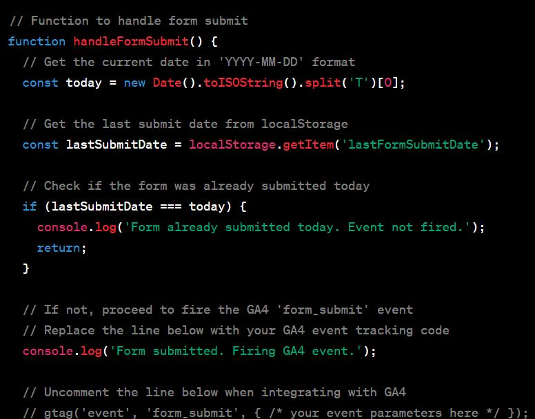 form_submit, é essencial verificar se o usuário já enviou o formulário hoje (usandolocalStoragepara armazenar essa informação). Isso evita que o evento seja disparado várias vezes pelo mesmo usuário no mesmo dia, mantendo sua contagem de eventos realista e confiável. - Função de Throttling (Limitação): Utilize uma função que evite o disparo do evento a cada vez que a página de agradecimento é recarregada. Isso garante que o evento seja disparado apenas na primeira vez que o usuário chega à página após um envio bem-sucedido, e não em visitas subsequentes.