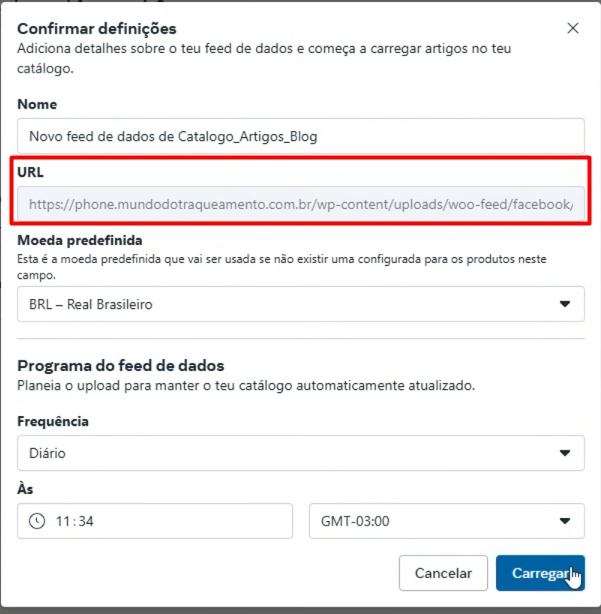 Cole a URL do ‘.XML’ e clique em ‘Carregar’.