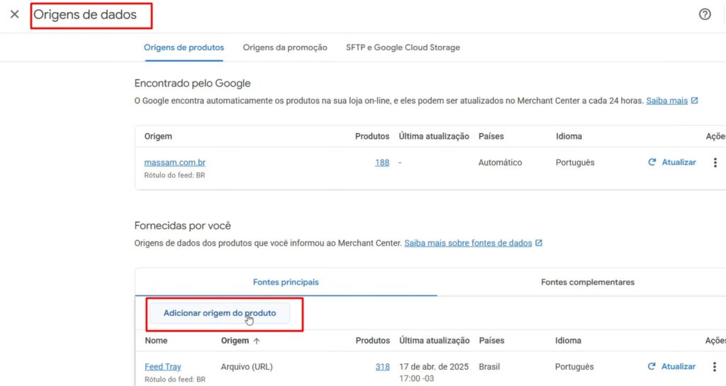 Dentro do ‘Google Merchant Center’, busque por Origem de Dados e em seguida clique em ‘Adicionar Origem do Produto.’