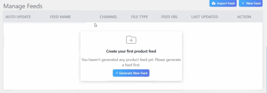 Acesse a primeira aba “Manage Feeds” e clique em “Create you first product feed”.